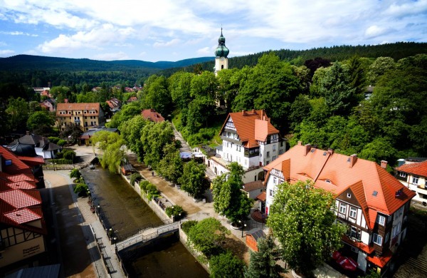 Jelenia Górától dél-nyugatra fekszik a cseh határnál a tengerszín felett 490-550 méterrel az Izerskie Hegység északi oldalán két hegy között: Stóg Izerski (1107 m) és Sepia Góra (828 m). A különleges hegyi klímája számos betegség gyógyítója. A várost hatalmas örökzöld erdők veszik körül.