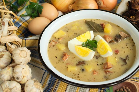 Ez az egyik legismertebb és legkülönlegesebb lengyel leves, Réges régen élt egy lengyel faluban egy nagyon fösvény kocsmáros. Kapzsiságból becsapta a szomszédait, azok pedig, mivel el akarták kergetni, segítséget kértek egy híres haspóktól. Ez a komoly vagyonnal rendelkező jövevény fogadott a kocsmárossal, hogy megeszi a legrosszabb levest, amit a kocsmáros főz neki, és nem kap tőle gyomorrontást. Ha ezt megteszi, a kocsmáros elhagyja a falut, ha nem, megkapja a vendég egész vagyonát. A szakács, jó keresetet látva a dologban, fogta a maradék rozs kenyérkovászt, mellédobott egy marék fonnyadt zöldséget, adott hozzá egy darab szárazkolbászt, gombát, egy kis maradék füstölt csülköt, és az egészet fokhagymával ízesített. A titokzatos vendég jóízűen megette a levest, és híre bejárta az egész vidéket.